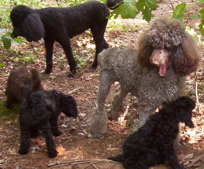 Annie and Tiara with pups in woods
