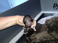 All is well in the end but at one point I was heading to the vet. The first one was very large and the second one was pretty big at 13.5oz. She has whelped large litters of very large puppies before so when with the third one, she started to act frantic, I was trying not to panic myself. She turned and twirled, and would jump up, then squat, then stretch out lengthwise, then start again. When she did this for 40 minuets and then started whimpering, I got worried and called the vet. Then she started pushing again, and voila!! I don’t know why this one was difficult as she was about 13 oz, not like the huge boy. And, after that, the fourth practically flew out ten minutes later. Velvet is so sweet, and such a good momma dog. I had to pick her up out of the box to go out afterwards and she hadn’t been out since morning. Doesn’t want to leave the babies. I feed her in the box. Give her broth and water in the box because she won’t come out. This lasts about four days with her. Then she starts coming out to so outside and then runs back into her babies. Sweet.